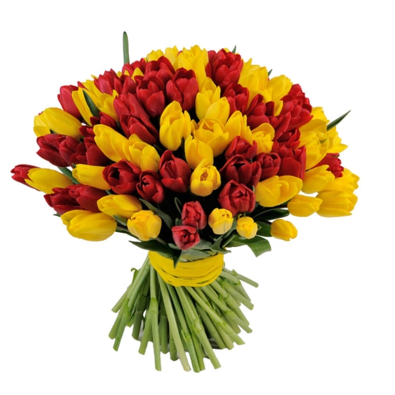 Букет состоит из 51 красный тюльпан, 50 желтых тюльпанов, атласная лента.