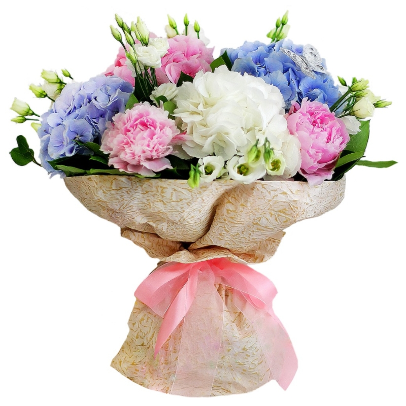 Букет состоит из 2 синие гортензии, 1 белая гортензия, 1 розовая гортензия, 5 розовых пионов, 10 белых эустом, зелень, красивая упаковка, атласная лента.