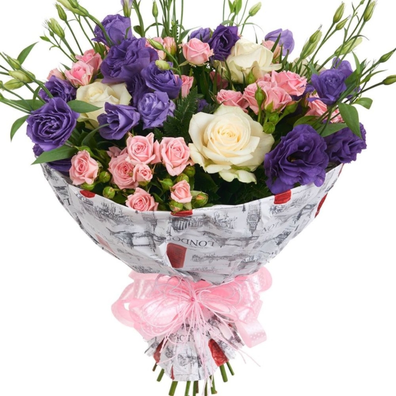Букет состоит из 3 белые розы, 5 розовых кустовых роз, 5 веток эустомы, зелень, красивая упаковка, атласная лента.